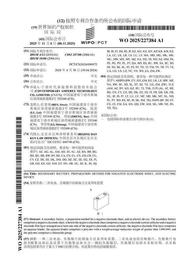 证券之星消息,根据企查查数据显示宁德时代(300750)公布了一项国际专利申请,专利名为“二次电池、负极极片的制备方法及用电装置”,专利申请号为PCT/CN2024/090972,国际公布日为2025年11月6日。