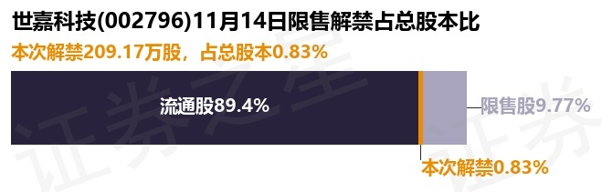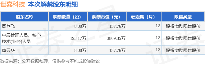 证券之星消息,根据市场公开信息整理,世嘉科技(002796)于11月14日将有209.17万股限售股份解禁,为公司股权激励限售股份,占公司总股本0.83%。(本次数据根据历史公告整理得出,实际情况以上市公司最新公告为准)本次解禁后,公司还有2465.87万股限售股份,占总股本9.77%。具体如下图所示: