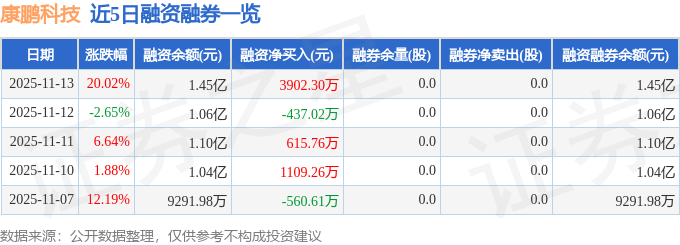 证券之星消息,截至2025年11月13日收盘,康鹏科技(688602)报收于11.45元,上涨20.02%,涨停,换手率20.48%,成交量53.18万手,成交额5.65亿元。