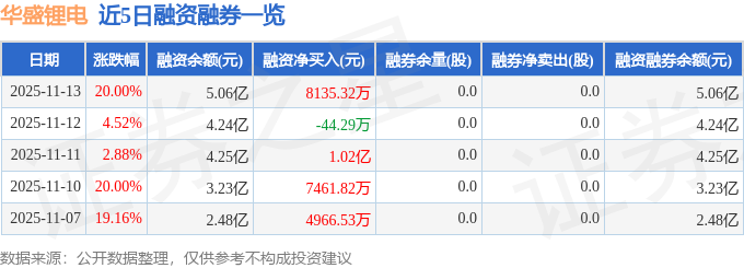 证券之星消息,截至2025年11月13日收盘,华盛锂电(688353)报收于120.0元,上涨20.0%,涨停,换手率10.24%,成交量12.19万手,成交额14.33亿元。