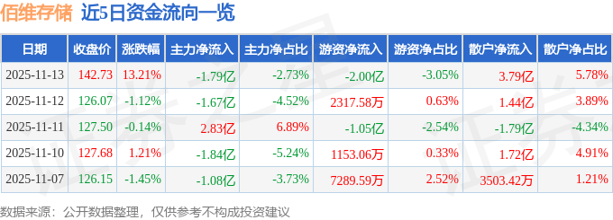 11月13日的资金流向数据方面,主力资金净流出1.79亿元,占总成交额2.73%,游资资金净流出2.0亿元,占总成交额3.05%,散户资金净流入3.79亿元,占总成交额5.78%。