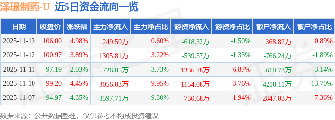 证券之星消息,截至2025年11月13日收盘,泽璟制药(688266)报收于106.0元,上涨4.98%,换手率1.5%,成交量3.97万手,成交额4.13亿元。