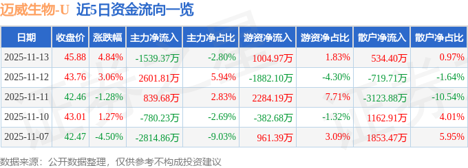 证券之星消息,截至2025年11月13日收盘,迈威生物(688062)报收于45.88元,上涨4.84%,换手率5.88%,成交量12.01万手,成交额5.5亿元。