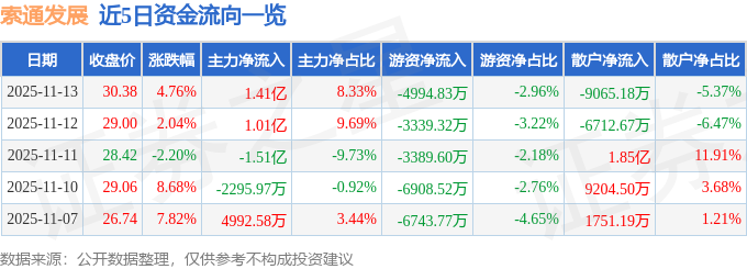 证券之星消息,截至2025年11月13日收盘,索通发展(603612)报收于30.38元,上涨4.76%,换手率11.19%,成交量55.75万手,成交额16.89亿元。