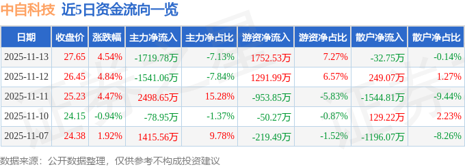 证券之星消息,截至2025年11月13日收盘,中自科技(688737)报收于27.65元,上涨4.54%,换手率7.29%,成交量8.72万手,成交额2.41亿元。