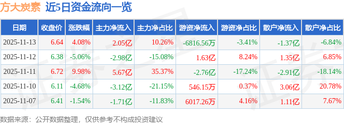 证券之星消息,截至2025年11月13日收盘,方大炭素(600516)报收于6.64元,上涨4.08%,换手率7.53%,成交量302.96万手,成交额19.98亿元。