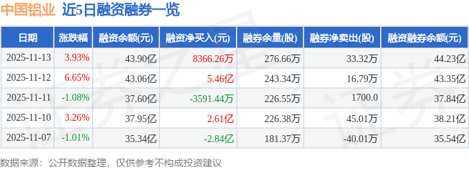 证券之星消息,截至2025年11月13日收盘,中国铝业(601600)报收于12.17元,上涨3.93%,换手率4.68%,成交量616.6万手,成交额73.63亿元。