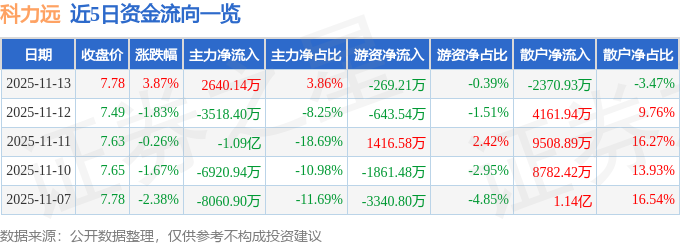 证券之星消息,截至2025年11月13日收盘,科力远(600478)报收于7.78元,上涨3.87%,换手率5.29%,成交量88.18万手,成交额6.83亿元。