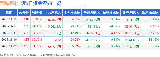 证券之星消息,截至2025年11月13日收盘,冠城新材(600067)报收于4.87元,上涨3.62%,换手率11.22%,成交量156.12万手,成交额7.62亿元。