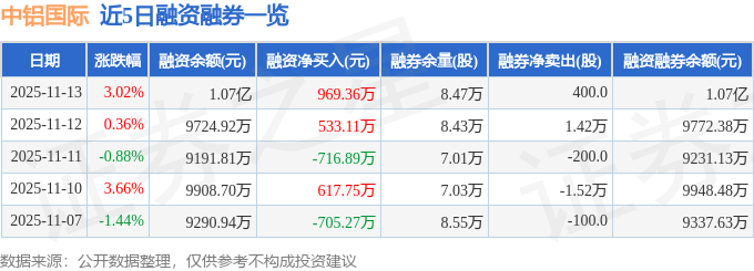 中铝国际融资融券信息显示,融资方面,当日融资买入2864.58万元,融资偿还1895.22万元,融资净买入969.36万元。融券方面,融券卖出500.0股,融券偿还100.0股,融券余量8.47万股,融券余额49.13万元。融资融券余额1.07亿元。