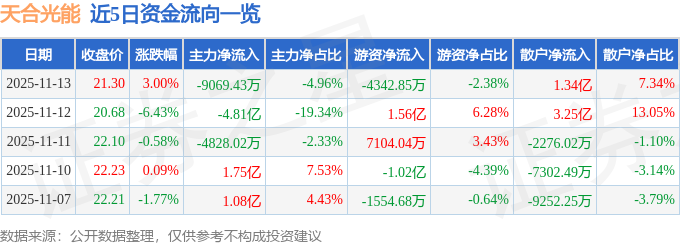 证券之星消息,截至2025年11月13日收盘,天合光能(688599)报收于21.3元,上涨3.0%,换手率3.95%,成交量86.18万手,成交额18.27亿元。