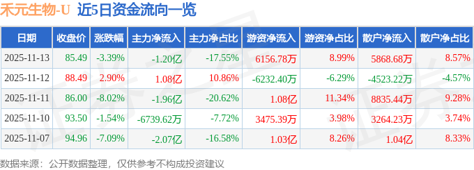 证券之星消息,截至2025年11月13日收盘,禾元生物(688765)报收于85.49元,下跌3.39%,换手率19.49%,成交量7.99万手,成交额6.85亿元。