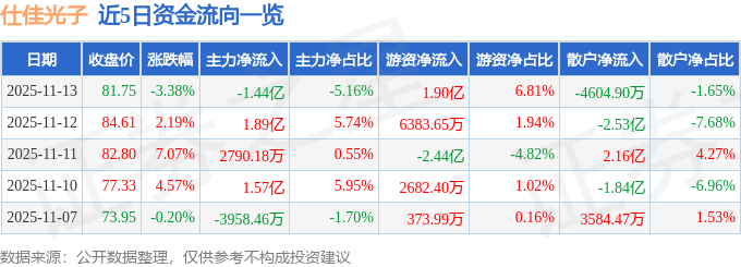 证券之星消息,截至2025年11月13日收盘,仕佳光子(688313)报收于81.75元,下跌3.38%,换手率7.4%,成交量33.96万手,成交额27.92亿元。