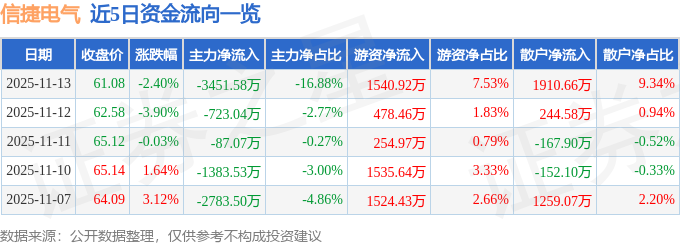 证券之星消息,截至2025年11月13日收盘,信捷电气(603416)报收于61.08元,下跌2.4%,换手率2.39%,成交量3.33万手,成交额2.05亿元。