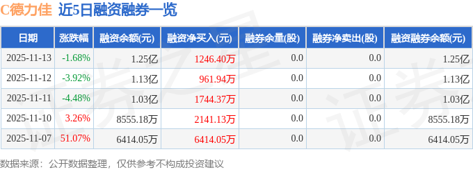 C德力佳融资融券信息显示,融资方面,当日融资买入4243.54万元,融资偿还2997.14万元,融资净买入1246.4万元,连续3日净买入累计3952.71万元。融券方面,融券卖出0.0股,融券偿还0.0股,融券余量0.0股,融券余额0.0万元。融资融券余额1.25亿元。