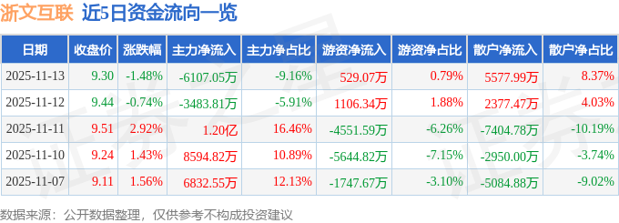 证券之星消息,截至2025年11月13日收盘,浙文互联(600986)报收于9.3元,下跌1.48%,换手率4.77%,成交量70.95万手,成交额6.66亿元。