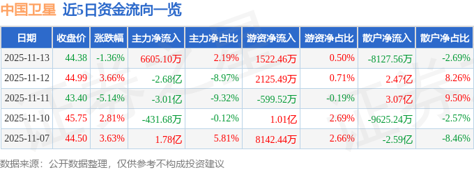 证券之星消息,截至2025年11月13日收盘,中国卫星(600118)报收于44.38元,下跌1.36%,换手率5.68%,成交量67.19万手,成交额30.22亿元。