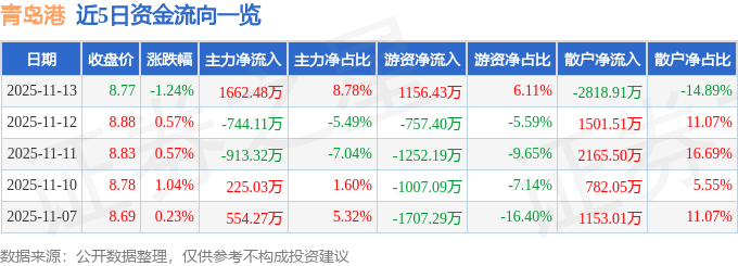 证券之星消息,截至2025年11月13日收盘,青岛港(601298)报收于8.77元,下跌1.24%,换手率0.4%,成交量21.65万手,成交额1.89亿元。