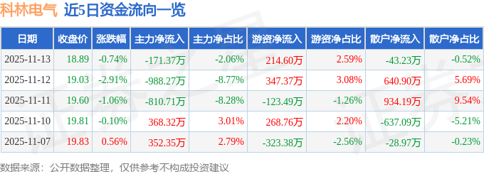 证券之星消息,截至2025年11月13日收盘,科林电气(603050)报收于18.89元,下跌0.74%,换手率1.09%,成交量4.4万手,成交额8300.36万元。