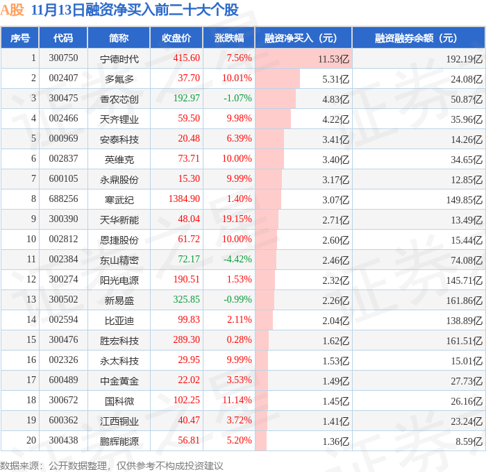 A股融资净买入前三分别为:宁德时代(300750)融资净买入11.53亿元、多氟多(002407)融资净买入5.31亿元、香农芯创(300475)融资净买入4.83亿元,前20具体见下表: