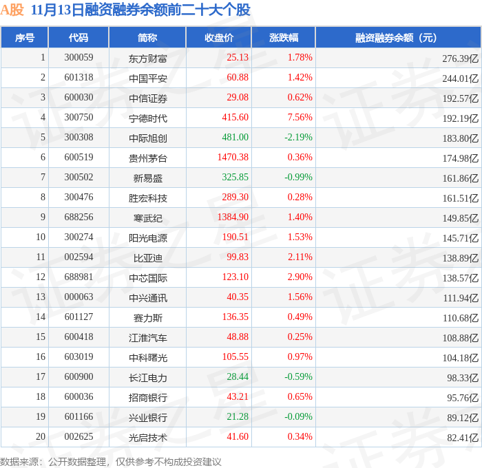 A股融资融券余额前三分别为:东方财富(300059)融资融券余额276.39亿元、中国平安(601318)融资融券余额244.01亿元、中信证券(600030)融资融券余额192.57亿元,前20具体见下表: