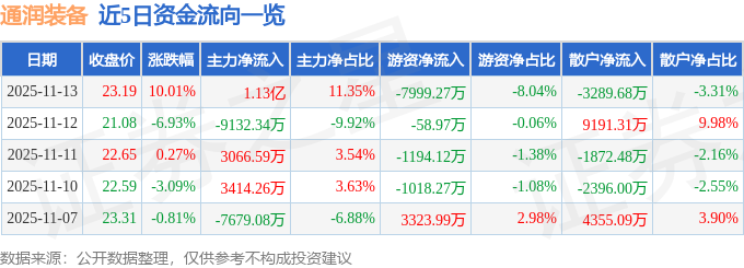 证券之星消息,截至2025年11月13日收盘,通润装备(002150)报收于23.19元,上涨10.01%,涨停,换手率12.44%,成交量44.59万手,成交额9.95亿元。