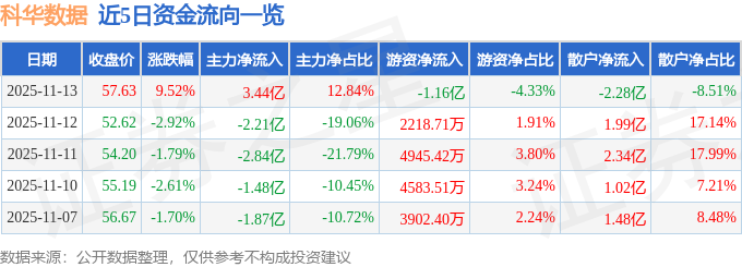 证券之星消息,截至2025年11月13日收盘,科华数据(002335)报收于57.63元,上涨9.52%,换手率10.57%,成交量48.08万手,成交额26.81亿元。
