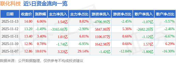 证券之星消息,截至2025年11月13日收盘,联化科技(002250)报收于14.0元,上涨6.06%,换手率15.47%,成交量138.45万手,成交额19.19亿元。