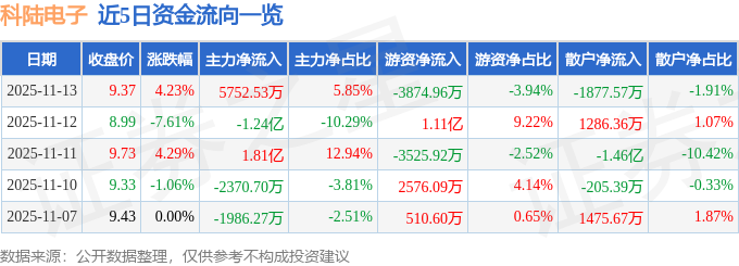 证券之星消息,截至2025年11月13日收盘,科陆电子(002121)报收于9.37元,上涨4.23%,换手率7.52%,成交量105.29万手,成交额9.84亿元。