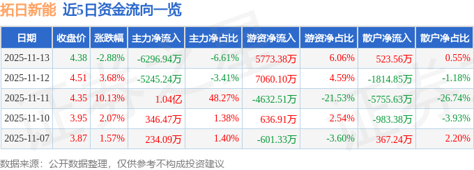 证券之星消息,截至2025年11月13日收盘,拓日新能(002218)报收于4.38元,下跌2.88%,换手率15.68%,成交量218.38万手,成交额9.53亿元。