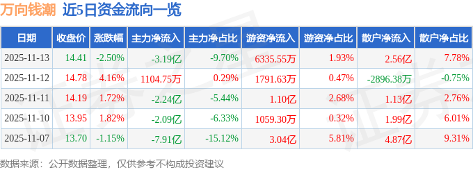 11月13日的资金流向数据方面,主力资金净流出3.19亿元,占总成交额9.7%,游资资金净流入6335.55万元,占总成交额1.93%,散户资金净流入2.56亿元,占总成交额7.78%。