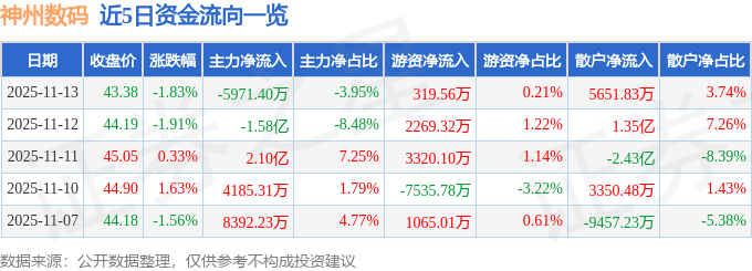 证券之星消息,截至2025年11月13日收盘,神州数码(000034)报收于43.38元,下跌1.83%,换手率5.76%,成交量34.83万手,成交额15.13亿元。