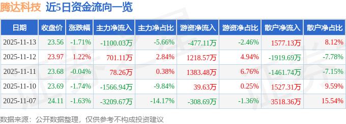 证券之星消息,截至2025年11月13日收盘,腾达科技(001379)报收于23.56元,下跌1.71%,换手率12.1%,成交量8.14万手,成交额1.94亿元。