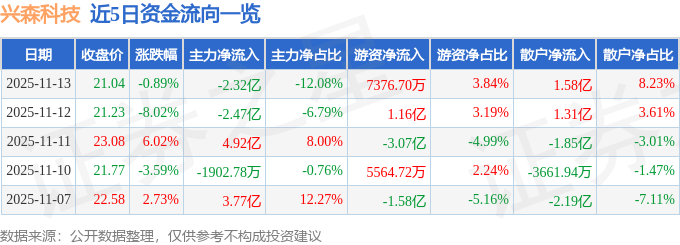 证券之星消息,截至2025年11月13日收盘,兴森科技(002436)报收于21.04元,下跌0.89%,换手率5.99%,成交量90.46万手,成交额19.2亿元。
