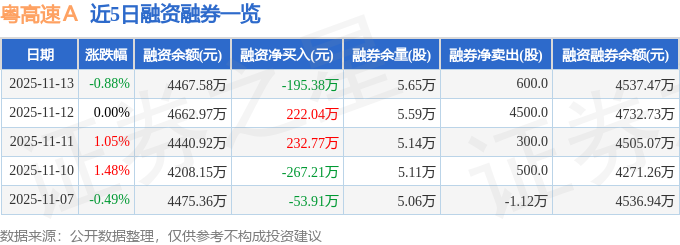 证券之星消息,截至2025年11月13日收盘,粤高速A(000429)报收于12.37元,下跌0.88%,换手率0.8%,成交量10.38万手,成交额1.28亿元。