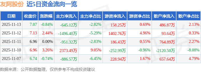 证券之星消息,截至2025年11月13日收盘,友阿股份(002277)报收于7.07元,下跌0.84%,换手率2.34%,成交量32.56万手,成交额2.28亿元。