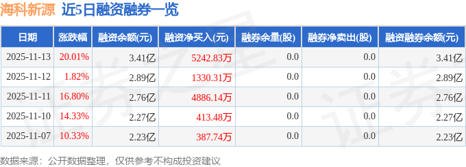 海科新源融资融券信息显示,融资方面,当日融资买入2.06亿元,融资偿还1.53亿元,融资净买入5242.83万元,连续3日净买入累计1.15亿元。融券方面,融券卖出0.0股,融券偿还0.0股,融券余量0.0股,融券余额0.0万元。融资融券余额3.41亿元。
