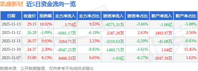 证券之星消息,截至2025年11月13日收盘,凯盛新材(301069)报收于29.15元,上涨10.92%,换手率16.06%,成交量62.85万手,成交额17.98亿元。