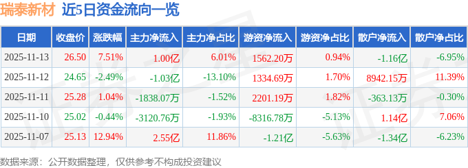 证券之星消息,截至2025年11月13日收盘,瑞泰新材(301238)报收于26.5元,上涨7.51%,换手率8.55%,成交量62.72万手,成交额16.66亿元。