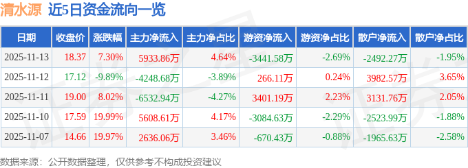 证券之星消息,截至2025年11月13日收盘,清水源(300437)报收于18.37元,上涨7.3%,换手率40.46%,成交量71.13万手,成交额12.8亿元。