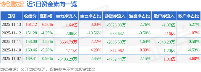 证券之星消息,截至2025年11月13日收盘,协创数据(300857)报收于161.12元,上涨6.5%,换手率3.83%,成交量13.21万手,成交额20.37亿元。