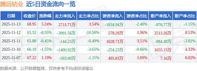 证券之星消息,截至2025年11月13日收盘,腾远钴业(301219)报收于68.95元,上涨5.24%,换手率3.85%,成交量11.13万手,成交额7.65亿元。