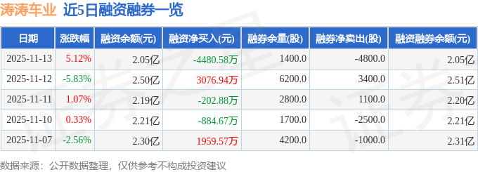 证券之星消息,截至2025年11月13日收盘,涛涛车业(301345)报收于213.6元,上涨5.12%,换手率7.29%,成交量2.12万手,成交额4.43亿元。