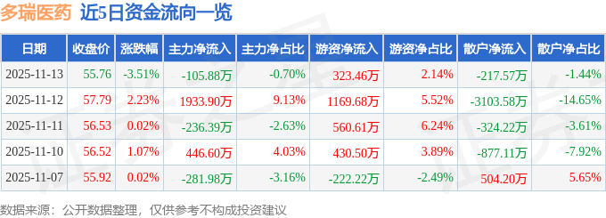 证券之星消息,截至2025年11月13日收盘,多瑞医药(301075)报收于55.76元,下跌3.51%,换手率3.39%,成交量2.71万手,成交额1.51亿元。