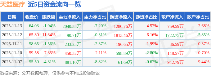证券之星消息,截至2025年11月13日收盘,天益医疗(301097)报收于64.03元,下跌1.94%,换手率15.64%,成交量4.53万手,成交额2.84亿元。