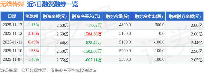 证券之星消息,截至2025年11月13日收盘,无线传媒(301551)报收于39.42元,下跌1.13%,换手率4.48%,成交量6.93万手,成交额2.73亿元。