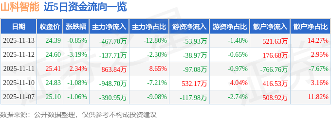 证券之星消息,截至2025年11月13日收盘,山科智能(300897)报收于24.39元,下跌0.85%,换手率1.71%,成交量1.5万手,成交额3654.54万元。