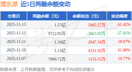 证券之星消息,11月13日,清水源(300437)融资买入1.3亿元,融资偿还7081.88万元,融资净买入5965.27万元,融资余额1.57亿元,近20个交易日中有11个交易日出现融资净买入。