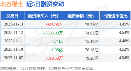 证券之星消息,11月13日,北方稀土(600111)融资买入5.14亿元,融资偿还4.76亿元,融资净买入3815.93万元,融资余额75.21亿元。
