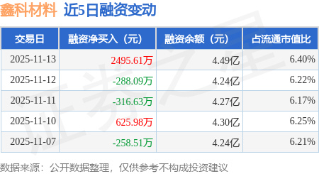 证券之星消息,11月13日,鑫科材料(600255)融资买入5733.15万元,融资偿还3237.54万元,融资净买入2495.61万元,融资余额4.49亿元。